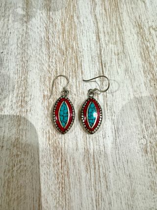 Elegantes pendientes de plata con incrustaciones. - Diseño ovalado. - Combinación de turquesa y rojo. - Cierre de anzuelo.