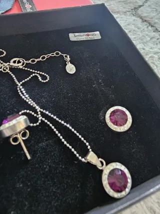 Elegante conjunto de colgante y pendientes de plata y circonitas. Diseño con piedras en tonos rosados y detalles plateados. Presentado en su caja original de El Corte Inglés. Nunca ha sido usado.
