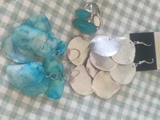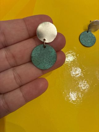 Pendientes colgantes con un diseño moderno y llamativo. - Acabado en plata y tono teal. - Diseño de discos superpuestos.