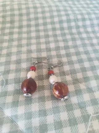 Pendientes hechos a mano con cuentas de madera y coral. - Cuentas de madera en tonos marrones. - Cuentas de coral en tono rojizo. - Cuentas blancas. - Cuentas metálicas plateadas.