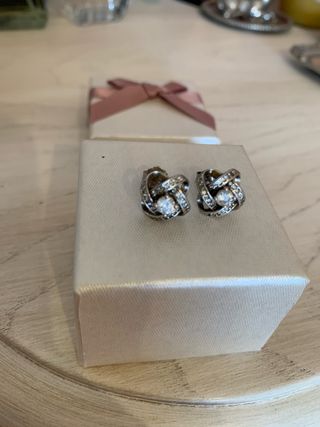 Elegantes pendientes de Pandora con diseño de lazo y detalles brillantes. Se encuentran en perfecto estado, como nuevos. - Diseño de lazo. - Adornados con pequeñas gemas brillantes.