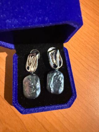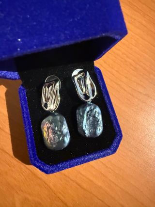 Elegantes pendientes con perlas naturales de forma irregular. - Perlas de color azul oscuro con reflejos plateados. - Cierre de presión plateado. Dimensiones: Longitud 36,5mm Dimensiones perlas 18x14,5mm Caja de terciopelo color azul real