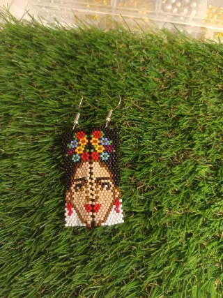 Pendientes artesanales inspirados en Frida Kahlo, elaborados con cuentas Miyuki. - Diseño detallado del rostro de Frida. - Colores vibrantes y alegres. - Cierre de anzuelo plateado.