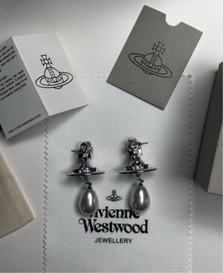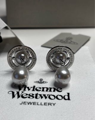 Elegantes pendientes de la marca Vivienne Westwood con diseño inspirado en Saturno. Cuentan con un acabado plateado y detalles de circonitas. Nuevo, con envoltorio original Envio rapido
