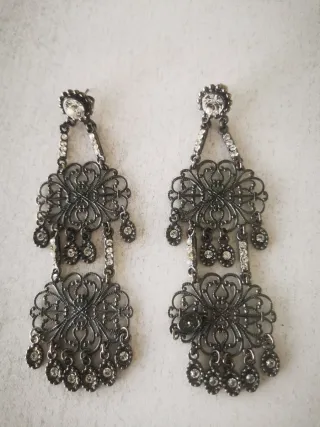 Elegantes pendientes largos, perfectos para ocasiones especiales. - Diseño intrincado con detalles. - Cierre de presión. - Adornados con pequeñas gemas. A uno le falta uno de los colgantes pero apenas se aprecia