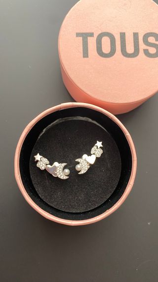 Preciosos pendientes de la marca Tous. - Diseño de corazón, luna y estrella. - Detalles en pedrería y perla. - Color plata y blanco.