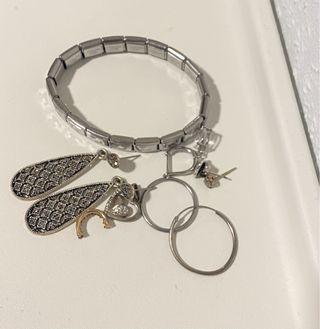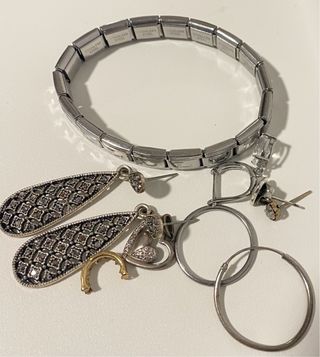Conjunto de varias piezas de joyería individual - Pulsera de eslabones de acero inoxidable. - Pendientes largos con diseño. - Pendientes de aro. - Colgante con forma de corazón y circonitas.
