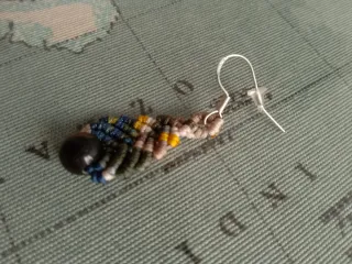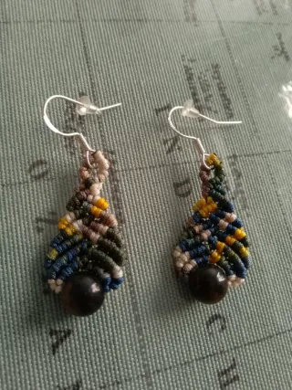 Pendientes hechos a mano con técnica macramé, combinando hilos verdes y mostaza. Cuentan con una cuenta oscura de mineral natural en la parte inferior y ganchos de Plata de Ley 925. - Diseño de macramé con hilos de colores. - Cuentas de piedra natural. - Ganchos de plata de Ley 925. Bonitos pendientes hechos a mano en técnica macramé, tonos mostaza y verdes rasgados, con ganchos de plata Ley 925, como se indica en su sello marcado.