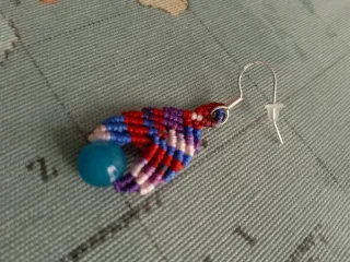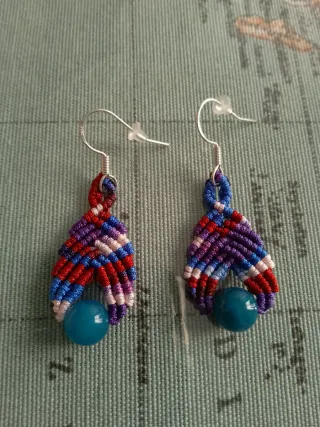Pendientes artesanales con un diseño único y llamativo. - Cuentan con una cuenta de ágata en tono azul oscuro. - Elaborados con hilos de colores rojo, azul y morado. - Enganche de plata 925. Bonitos pendientes hechos a mano en técnica macramé, tonos azules y rojos rasgados, con ganchos de plata Ley 925, como se indica en su sello marcado.