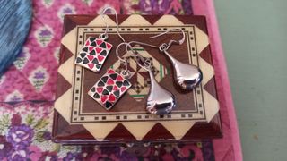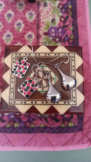 Dos pares de pendientes, no llegaron a usarse los mando en la cajita. Conjunto de dos pares de pendientes de plata. - Un par con diseño geométrico en esmalte rojo, negro y plata. - Otro par con forma de lágrima pulida en plata.