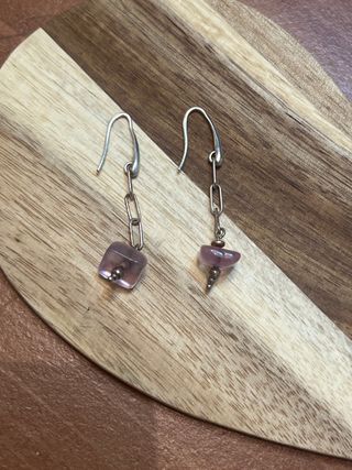 Elegantes pendientes colgantes con detalles en plata y piedra de fluorita morada. Un accesorio delicado y llamativo. - Cierre de anzuelo seguro. - Diseño con eslabones y piedra facetada. - Combina plata y tonos morados.