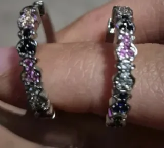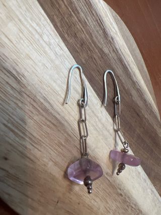 Conjunto de pendientes con detalles en plata y piedras moradas. - Diseño elegante con aros. - Piedras con forma de lágrima y corazón. Los pendientes se venden el par 7 €