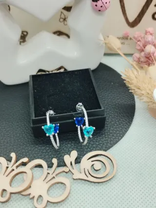 Pendientes de plata S925, con un diseño de aro abierto y doble corazón. - Diseño de corazón en tonos azules. -Cierre de tuerca presión. -Medida 20mm. Se envía en cajita regalo. Información sin compromiso. Se hacen envíos.