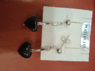 Pendientes con corazones de azabache natural, tallados a mano, y piezas de plata de ley de 925 milésimas. - 3,5 cm. de largo. - Colgante de azabache natural. - Cierre de presión en plata de ley. - Diseño moderno y llamativo.