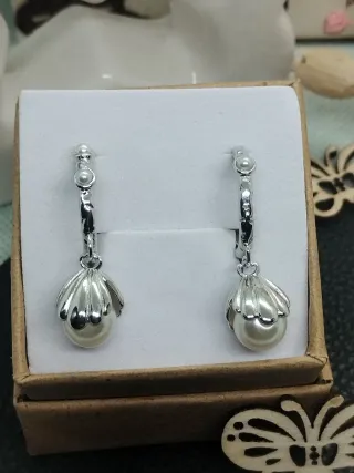 Elegantes pendientes con un diseño moderno y sofisticado. - Diseño de lazo con circonitas incrustadas. - Perla colgante. - Acabado plateado brillante.