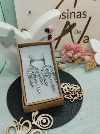 Pendientes de aro con diseño de atrapasueños. - Detalle de plumas colgantes. - Adornados con pequeñas circonitas de colores. -Medida total 51mm. Nuevos sin uso. -Con caja de regalo como se ve en la foto. Información sin compromiso. Se hacen envíos.