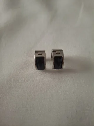 Elegantes pendientes tipo aro con un diseño moderno. - Acabado plateado. - Detalle central en negro. - Cierre seguro.
