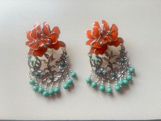 Elegantes pendientes con un diseño inspirado en la naturaleza. - Detalle de flor esmaltada en tonos naranjas. - Colgantes con cuentas de color turquesa. - Elaborados con metal plateado.