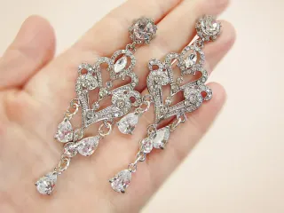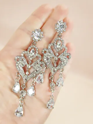 Elegantes pendientes estilo chandelier con un diseño intrincado y adornados con brillantes. - Diseño chandelier. - Detalles con pedrería. - Cuelgan con varias gotas.