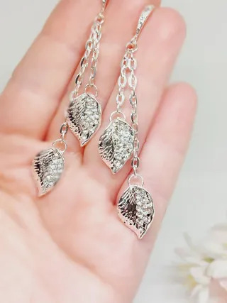 Elegantes pendientes largos con diseño de hojas. Cuentan con un detalle de brillantes que les aporta un toque de luz. - Diseño de hojas en cascada. - Cadena plateada. - Cierre de presión.