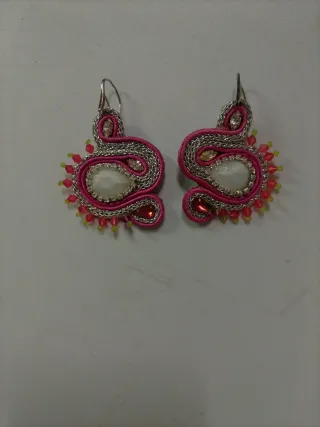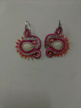 Pendientes artesanales con técnica soutache. - Decorados con cristales Swaroski. - Piedra central de ágata blanca. - Detalles en tonos fucsia y plateado.