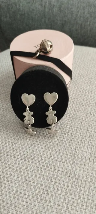 Pendientes largos de la marca Tous con un diseño encantador. Usado solo una vez. - Colgante con forma de corazón. - Figura de oso. - Detalle de estrella. - Acabado plateado.