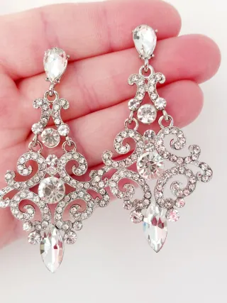 Pendientes elegantes en tono plateado con pedrería brillante y diseño calado en forma de lágrima. Ideales para novia, invitada o eventos especiales. Muy favorecedores y con aire clásico. • Largo: 6,3 cm • Ancho: 2,5 cm • Peso: 9 g el par • Cierre de presión • Estado: sin estrenar
