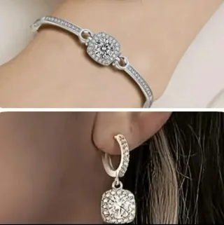 Elegante conjunto de joyería compuesto por una pulsera y unos pendientes - Elaborados en Plata de Ley 925 con baño en oro de 18 Quilates / rodiado...Con contraste en las piezas -Pulsera con detalle central.: Una MOISSANITA de 1 Quilate.Precio individual:79€ - Pendientes de presión con MOISSANITAS de 0,5 Quilates cada una ..Un Total de 1Quilate. Con REGALO de presiones de silicona. Precio individual: 44€. - En caja de regalo 🎁 Conjunto por 99€ NO negociable.