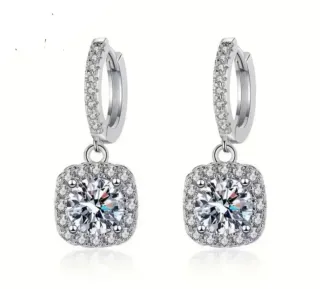 Elegantes pendientes Moissanita con certificado Gemológico de autenticidad GRA. - Diseño cuadrado con halo de pequeñas gemas - Piedra central : Moissanita gris de 0,5 quilates cada uno. Un total de 1 quilate. - Cierre de presión seguro -Sin estrenar...nuevo - En caja de 🎁 regalo NO negociable .