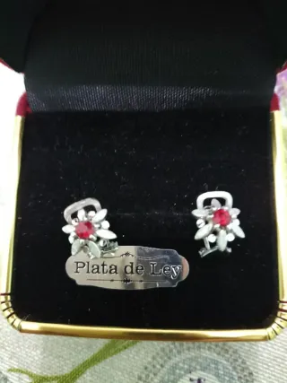 Elegantes pendientes de plata con un diseño floral y una piedra roja central. El detalle Plata de Ley añade un toque de autenticidad. - Elaborados en plata. - Detalle de piedra roja. - Inscripción Plata de Ley.