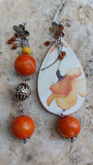 Pendientes colgantes con un diseño floral y cuentas. - Cuentas esféricas de color naranja brillante. - Detalle de cuenta plateada calada. - Colgante con estampado de flor naranja y verde. - Cierre a presión. 🌿 Hechos a mano. Cada pieza es única e irrepetible. 👉 ¿Te gustó? Escríbeme sin compromiso por disponibilidad y precio ✨ Y no olvides seguirme para no perderte nada 👀. Envíos internacionales ✈️