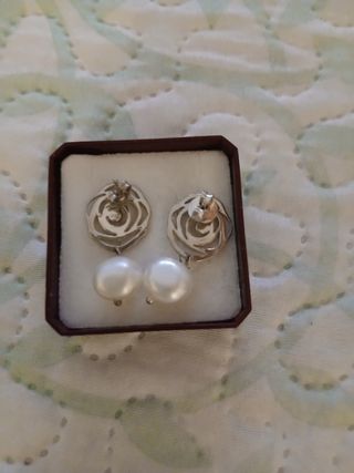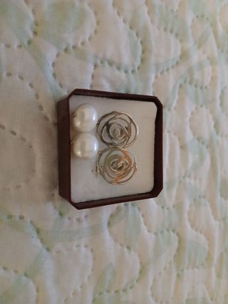 Preciosos pendientes de plata con perlas. Son dos pares: unos de perlas blancas y otros con diseño de roseta. - Diseño elegante y delicado. - Perlas de color blanco. - Material: Plata.