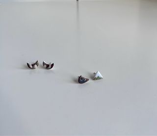 Conjunto de pendientes con diseños únicos y llamativos. - Dos pendientes con forma de media luna. - Un pendiente con forma de montaña. - Un pendiente con forma de animal o figura. - Acabado plateado y multicolor.