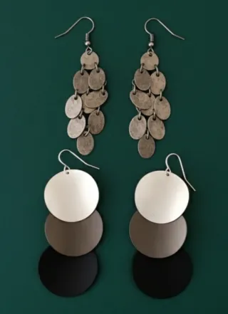 Pendientes largos con diseño de círculos superpuestos y acabado mate. - Diseño moderno y elegante. - Combinación de tres colores: plateado, gris y negro. Segundo par diseño en cascada con plaquetas color gris