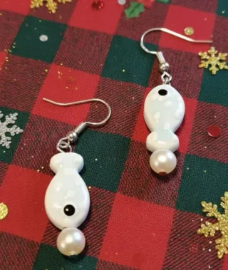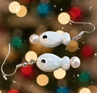 Pendientes hechos a mano con cerámica y detalles de perlas de agua dulce. - Diseño único con forma de pez. - Cuentas de cerámica blanca con puntos. - Cuelgan de un cierre de anzuelo de plata