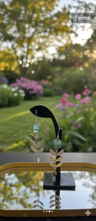 Elegantes pendientes largos con un diseño inspirado en hojas y una piedra central. - Cierre de anzuelo. - Diseño de hojas plateadas. - Piedra central con tonos turquesa y marrones.