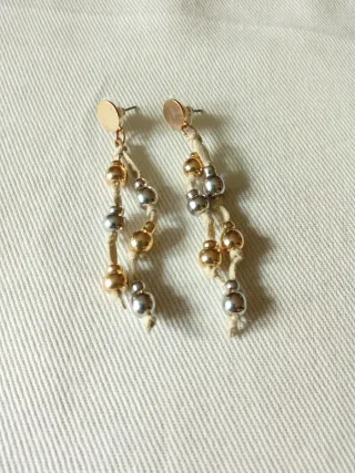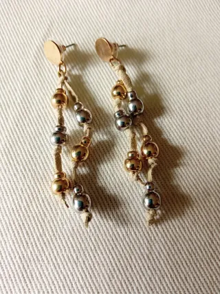 Pendientes largos con un diseño bohemio y elegante. - Cuentas metálicas en tonos dorados y plateados. - Cuerda trenzada de color natural. - Cierre de presión.