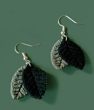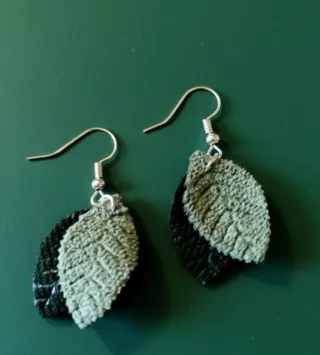 Pendientes con diseño de hojas, combinando plata y tela. Son ligeros y aportan un toque natural a tu estilo. - Cierre de anzuelo. - Detalle de dos hojas superpuestas.