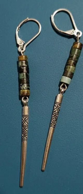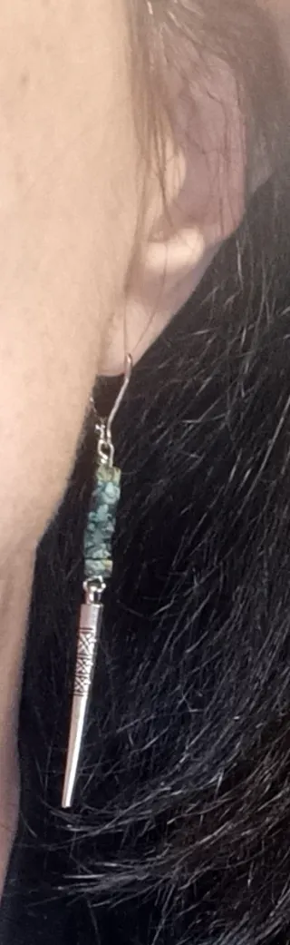 Pendientes largos artesanales con cuentas de turquesa africana y detalles plateados. - Cuentas de turquesa africana apiladas. - Colgante metálico con grabado. - Cierre de tipo leverback