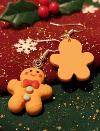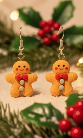 Pendientes divertidos y realistas con forma de hombrecillo de galleta de jengibre de resina, colgador de acero y gancho de plata. - Diseño festivo. - Cierre de anzuelo de plata