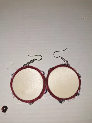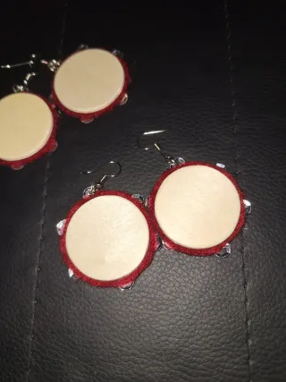 Pendientes con diseño de pandereta.Hechos a mano con madera fieltro y ferreñas de lentejuelas - Círculos de madera en tono beige. - Borde de fieltro rojo. Ferreñas plateadas