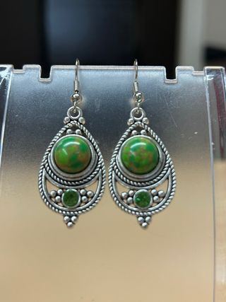 Preciosos pendientes vintage. Son dos pendientes de diseño elegante y delicado. - Elaborados en plata y con piedras de color verde. - Tienen un diseño con forma de gota. - Ideales para añadir un toque de sofisticación a tu look. Le falta una piedra que cadí no se nota se puede apreciar en la foto número 4 pq hago zoom. Contraste plata de ley.