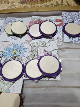 Pendientes artesanales con diseño de pandereta. Hechos con madera,fieltro morado ferreñas de lentejuelas plateadas