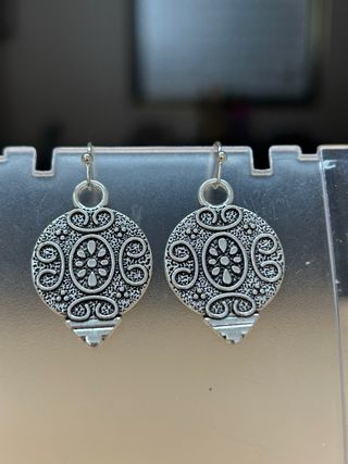 Elegantes pendientes con un diseño intrincado. - Fabricados en aleación de zinc. - Acabado plateado. - Diseño redondo con detalles ornamentales.
