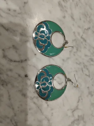 Elegantes pendientes de aro con un diseño llamativo. - Plateados con esmalte turquesa. - Detalle de diseño floral. - Cierre de gancho.