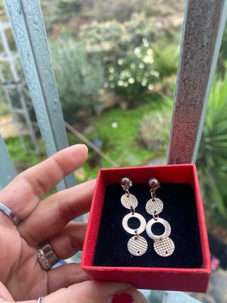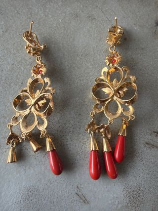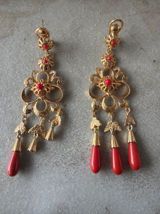 Elegantes pendientes colgantes de plata dorada , le faltan 2 colgantes rojos como se aprecia en las fotos