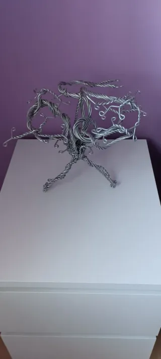 Original árbol de alambre plateado, perfecto para organizar tus joyas. - Diseño artístico y moderno. - Base estable con varias ramas para colgar collares, pulseras y pendientes.