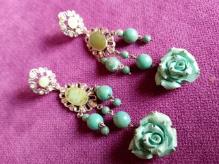 Conjunto de bisutería vintage con varios accesorios. - Pendientes de clip morados con diseño. - Pendientes largos con flecos verdes y detalles dorados. - Pendientes de botón con piedras transparentes. - Anillos plateados con detalles. - Collar con cuentas moradas y doradas. - Colgante con camafeo. - Pendientes largos con estrellas y piedras. - Pendientes con forma de oso. - Pendientes rojos rectangulares.