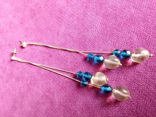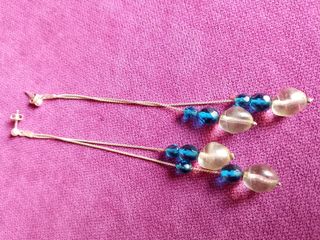 Elegantes pendientes largos con un diseño delicado. - Cuentas de cristal azul y transparente. - Cadena fina plateada. - Cierre de presión.