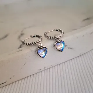 Elegantes pendientes con forma de corazón. - Diseño de aro con textura. - Colgante de corazón con detalles iridiscentes. - Acabado en plata.